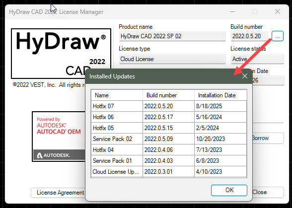 - Go to Help tab > License Information. Below are details for HyDraw CAD2022 installed updates.