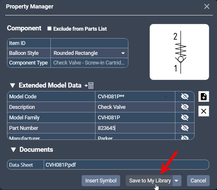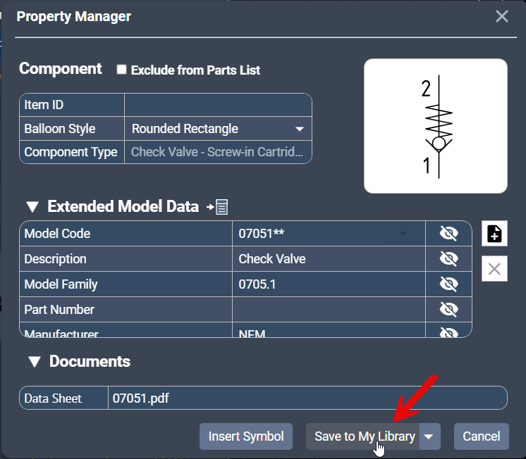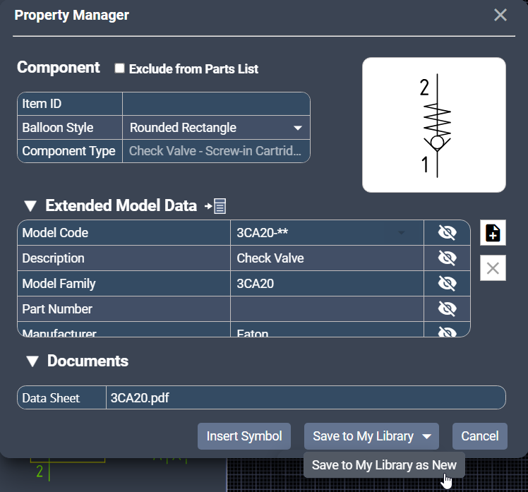 After saving a symbol to My Library, you may want to update the model data associated with that symbol or save a new version of the data as a separate component. NetSkeme Plus provides two options: